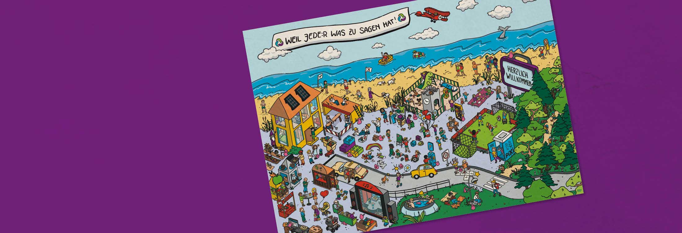 Wir laden euch herzlich zu einer Entdeckungsreise in unser Wimmelbild ein. Schaut euch um zwischen den vielen Figuren und Gegenständen. Taucht ein in die Szenen und seht, was dort alles geschieht. Beschreibt, was euch auffällt und erfindet kleine Geschichten dazu.