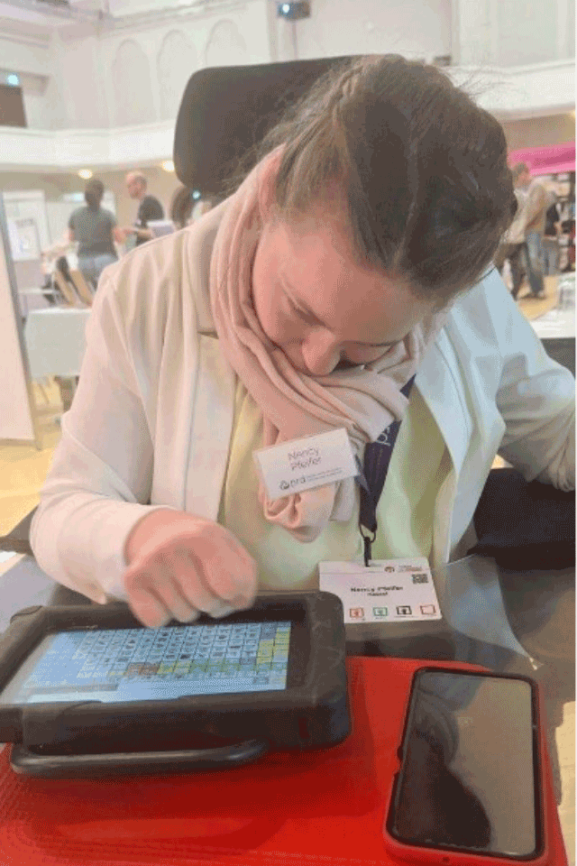 Ich heiße Nency Pfeifer und bin 28 Jahre alt. Da ich wegen einer Gehirnblutung unter meiner Geburt weder laufen noch selber sprechen kann, kommuniziere ich mit meinen Mitmenschen über einen Sprachcomputer: einen sogenannten Accent 800 mit der Wortstrategie 144.