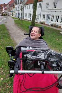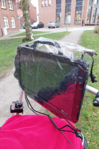 Dennis ist gern bei jedem Wetter draußen. Natürlich will er auch bei Regen kommunizieren. Sein Accent 1400 mit Augensteuerung ist natürlich spritzwassergeschützt. Aber das Gerät soll natürlich auch dann einsatzfähig sein, wenn es mal so richtig pladdert. Deswegen hat Dennis für seinen Talker einen zusätzlichen Regenschutz gebastelt. Der schaut großartig aus, wie wir finden.