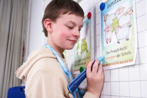 Mit dem verstellbaren Umhängeband kann der Anybook Pro um den Hals getragen oder an auch der Tafel befestigt werden. Dank verstellbarer Länge und Sicherheitsverschluss, der sich bei zu starkem Zug von selbst öffnet, eignet sich das Band für Kinder genauso wie für Erwachsene.