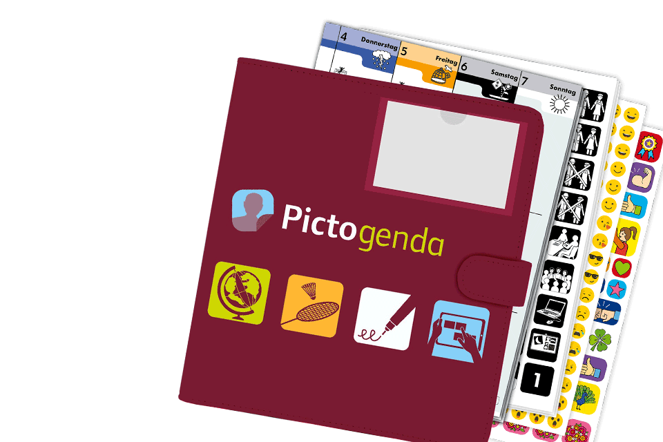 Termine und Aktivitäten können mit Hilfe der dazugehörigen Piktogramm-Aufkleber eingetragen werden. Für die Schüler unter euch gibt es Stundenpläne. Eine Übersicht über die verschiedenen Symbole und deren Bedeutung ist auf der Pictogenda Club-Seite zu finden. Die Pictogenda wird meist individuell genutzt und kann täglich zur Schule oder Arbeit mitgenommen werden.
