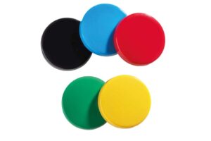 Kleine Drucktaste (Durchmesser 3,5 cm) in verschiedenen Farben von AbleNet. Die gesamte bunte Tastenoberfläche kann gedrückt werden.