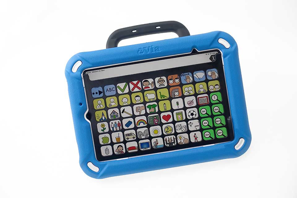 Der Via Mini: Unsere neue, robuste und leistungsfähige 8″-Kommunikationshilfe auf iOS-Basis. Der Via Mini bietet den vertrauten Komfort von iOS, ist aber widerstandsfähiger gegen Stürze und besser gegen Wasser und Staub geschützt als sein Vorgänger, der PRiO 8. Der eingebaute Verstärker ermöglicht hohe Wiedergabelautstärken, zudem bietet der Via Mini einen praktischen Tragegriff und Aufstellbügel. Als Basis dient das iPad Mini.