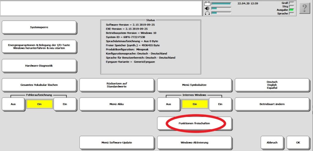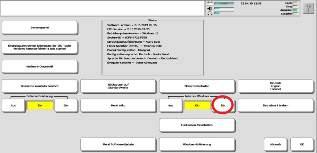 Hinweis! Sollten Sie die Aktivierung des internen Windows beantragt haben, gehen Sie nach dem Neustart wieder in die Toolbox > Menü System und aktivieren Sie Internes Windows indem Sie die Funktion auf Ein stellen